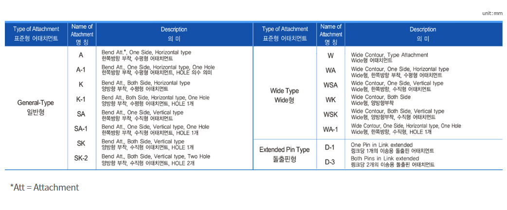 * 표준형 로울러체인에 어태치먼트를 부착한 체인으로 메인 체인의 세부 치수는 표준형 로울러 체인을 참조 하십시오.