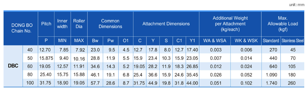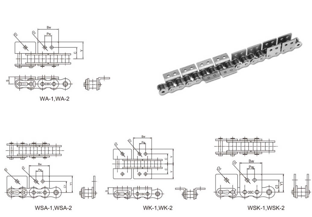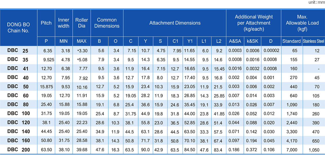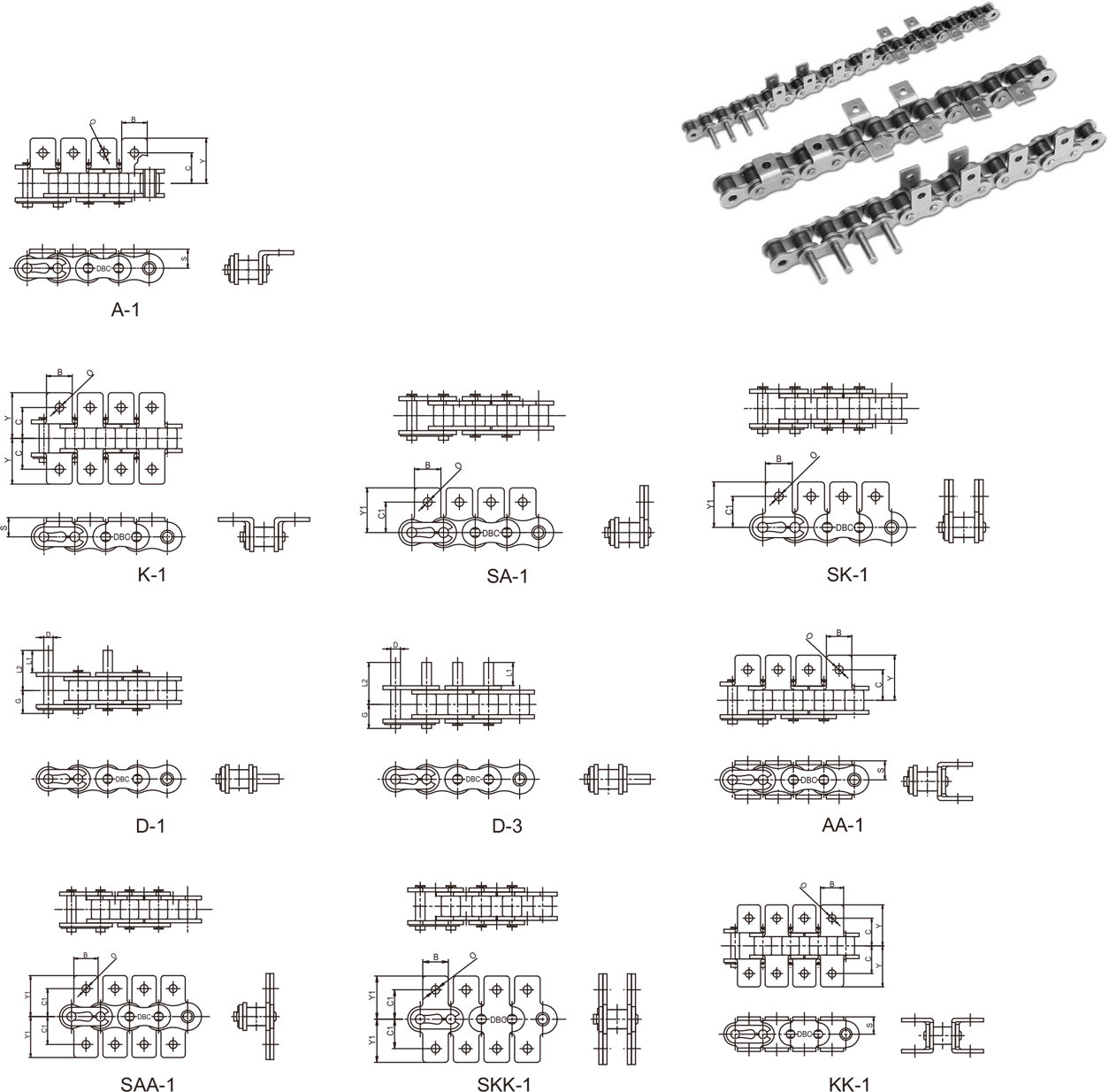 * 표준형 로울러 체인에 어태치먼트를 부착한 체인으로 메인 체인의 세부 치수는 표준형 로울러 체인을 참조 하십시오.