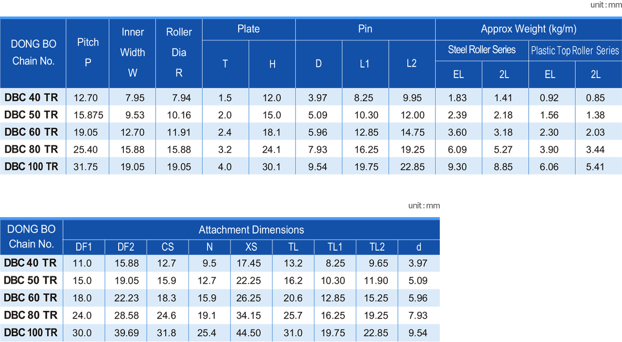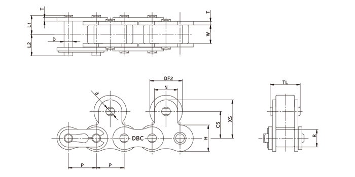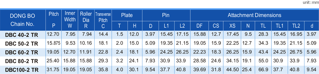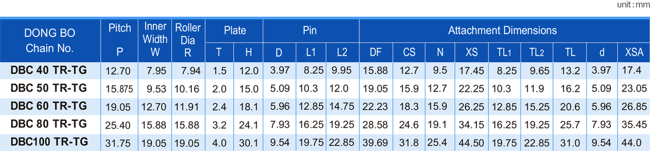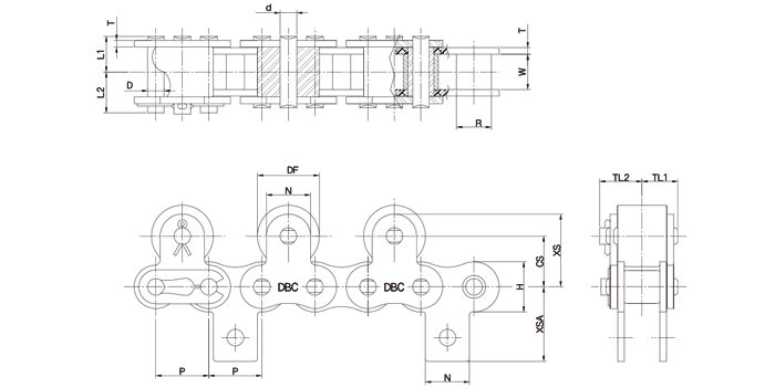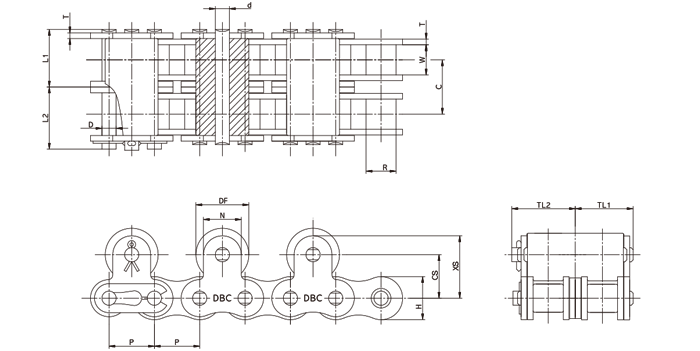 * DBC 40~60TR체인에는 스프링클립형 연결구가 80번 이상에는 코터핀형 연결구가 표준으로 제공됩니다.
