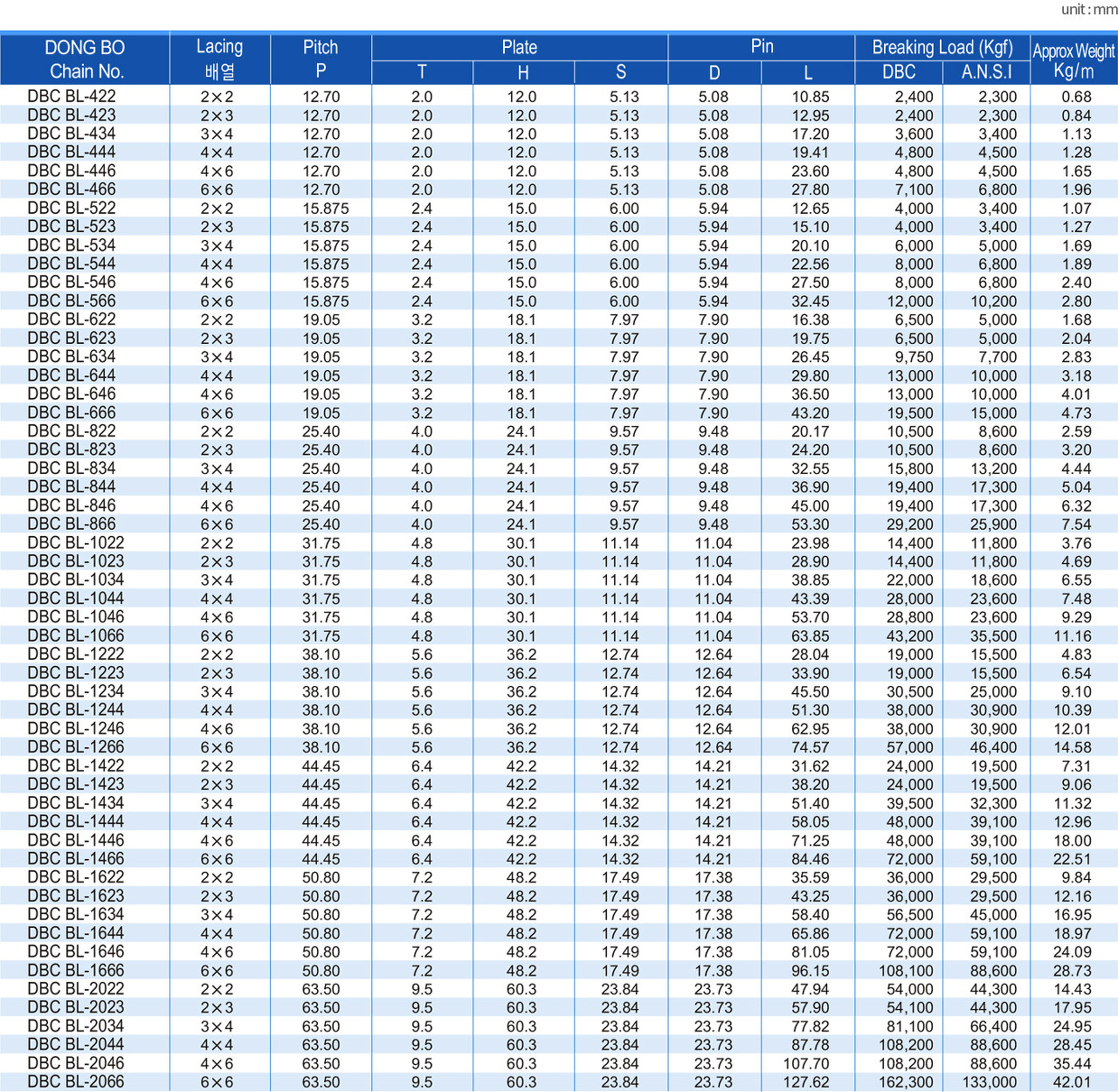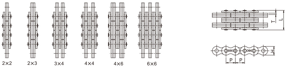 플레이트의 외형은 표준형 로울러 체인과 동일하나 플레이트의 두께 및 핀외경은 1사이즈 높은 피치의 로울러 체인의 것과 동일합니다.
