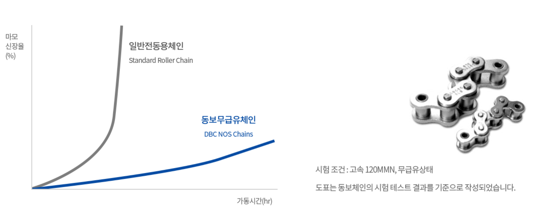 - 저속(30M/min)사용시 - 일반 표준형체인의 40배, 일반 속도 (90M/min)내 사용시 최소 10배의 사용수명의 연장이 가능합니다.