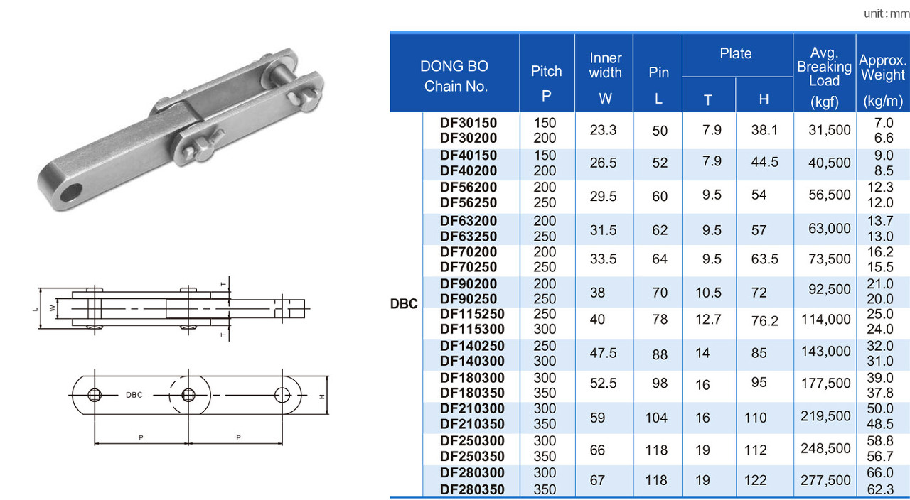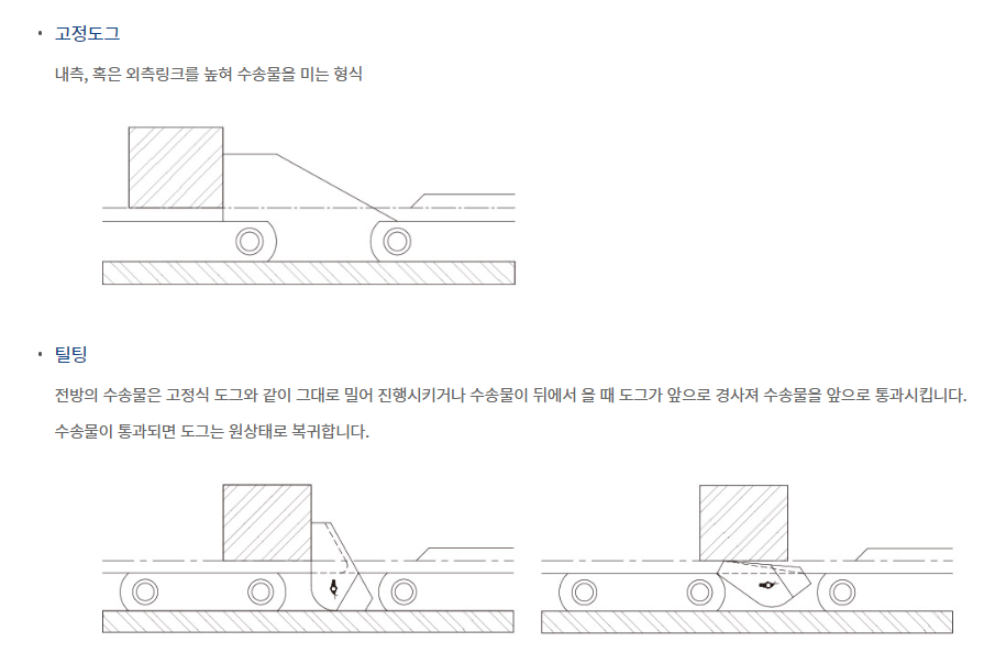 구조상 강도, 내마모성, 내열성이 우수하여 가혹한 환경에 사용되는 컨베이어에 최적의 체인입니다. 일반적으로 도그(Dog)를 취부하여 각종의 수송물을 운반합니다.