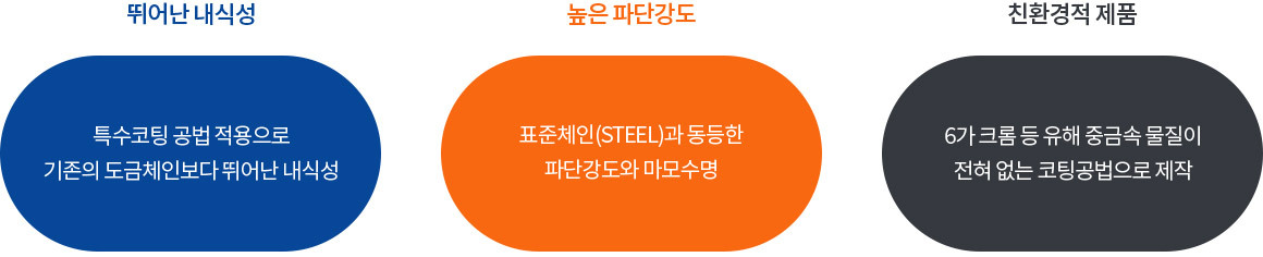 크롬도금 체인보다 월등히 뛰어난 내식성 기능을 가진 특수 체인입니다.