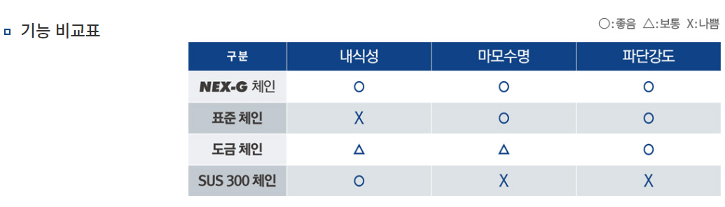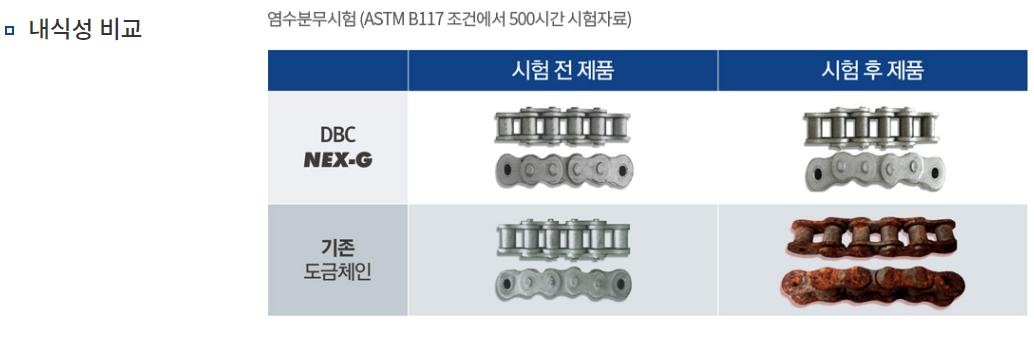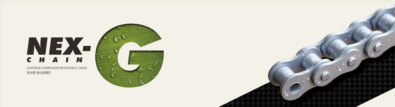 NEX - GUARD의 약자로서 전부품을 특수코팅 처리 제작하여 부식환경으로 부터 체인을 보호하며 우수한 녹발생 방지 기능 및 기존의 아연도금, 니켈도금,